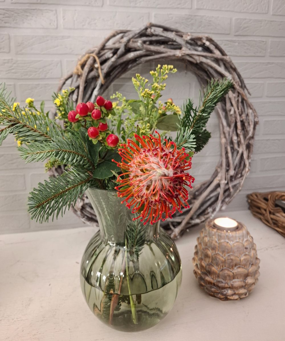 Aber "winterlich" darf es natürlich noch bleiben! So dürfen Zapfen und Tannenzweige weiterhin liegen und stehen bleiben und auch in meinem Sträußchen gehts noch winterlich zu. Die Blumen habe ich mir als einzelne Zweige bei der Blumenfrau mitgenommen, die Tannenzweige hatte ich noch im Garten liegen und ein paar davon mit in die Vase gestellt.